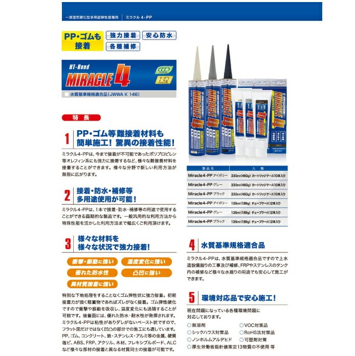ミラクル4 Miracle4-PP ヘルメチック チューブ 135ml本 HT-BOND 接着 防水 補修 グレー アイボリー ブラック 004